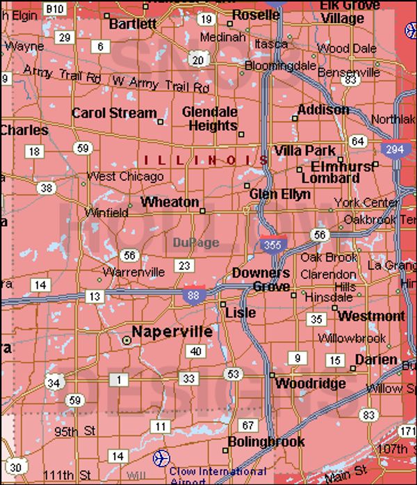 Addison, Bensenville, Bloomingdale, Bolingbrook, Carol Stream, Clarendon Hills, Darien, Downers Grove, Elmhurst, Glendale Heights, Glen Ellyn, Hinsdale, Itasca, Lisle, Lombard, Medinah, Naperville, Oakbrook, Roselle, Villa Park, Warrenville, Westmont, West Chicago, Wheaton (County Seat), Willowbrook, Winfield, Woodbridge, Wood Dale, York Center