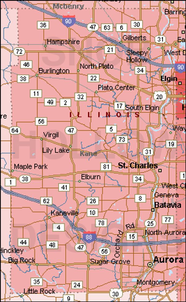 Aurora, Batavia, Burlington, Carpentersville, Elburn, Elgin, Geneva (County Seat), Gilberts, Hampshire, Lily Lake, North Aurora, Pingree Grove, Sleepy Hollow, St. Charles, South Elgin, Sugar Grove, Virgil, West Dundee