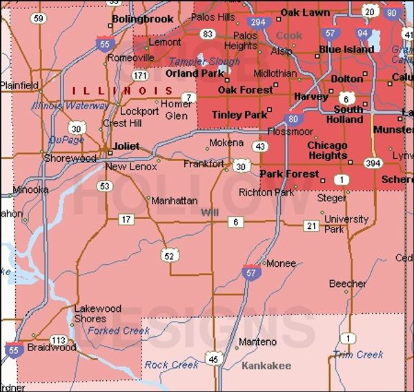 Beecher, Bolingbrook, Braidwood, Crest Hill, Frankfort, Homer Glen, Joliet (County Seat), Lakewood Shores, Lockport, Manhattan, Mokena, Monee, New Lenox, Plainfield, Romeoville, Shorewood, Steger, University Park